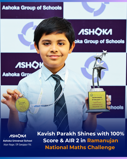 Mast. Kavish Parakh of Ashoka Group of Schools secured a perfect 100% score and All India Rank 2 in the RNMC (Ramanujan National Maths Challenge) 2025 (Interview Test – Class 4), conducted by AICTSD.