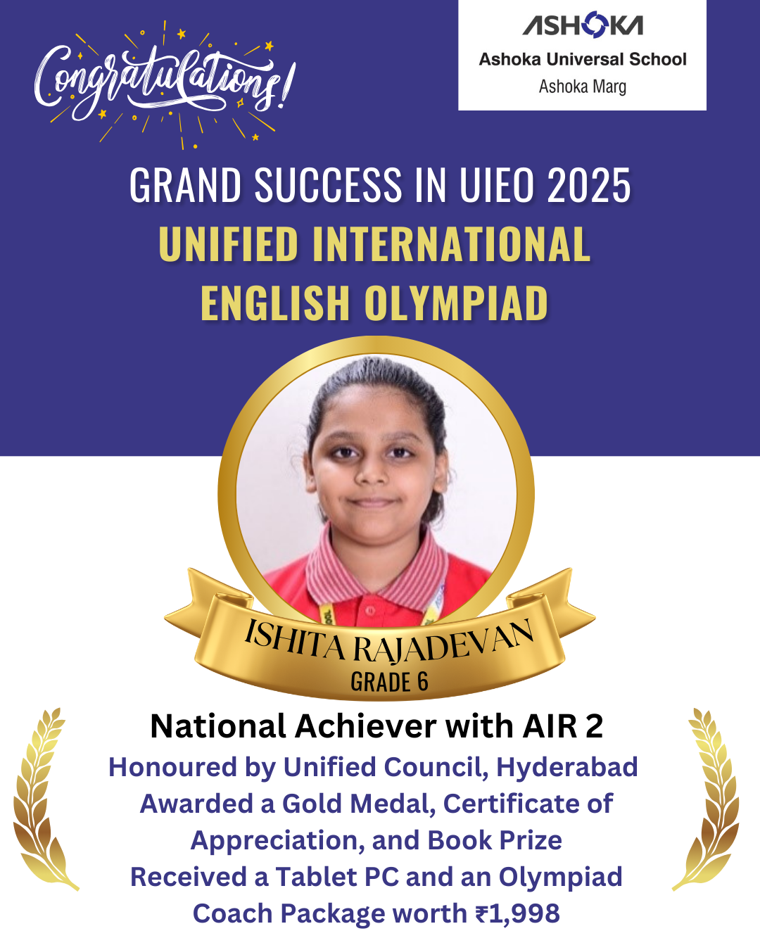 🏆 Star Achiever: Ishita Rajadevan (Grade 6) secured All India Rank 2, earning national recognition from the Unified Council, Hyderabad, along with a Gold Medal, Certificate of Appreciation, Book Prize, Tablet PC, and an Olympiad Coach Package.