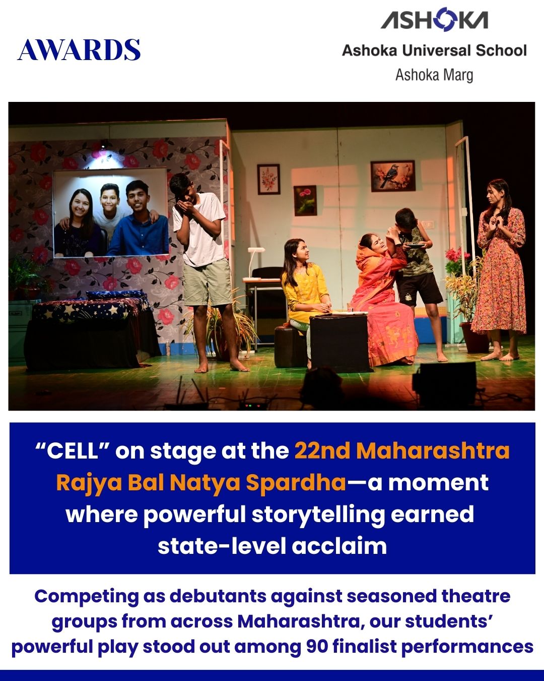 Ashoka Universal School, Ashoka Marg proudly made its debut appearance at the prestigious 𝟮𝟮𝗻𝗱 𝗠𝗮𝗵𝗮𝗿𝗮𝘀𝗵𝘁𝗿𝗮 𝗥𝗮𝗷𝘆𝗮 𝗕𝗮𝗹 𝗡𝗮𝘁𝘆𝗮 𝗦𝗽𝗮𝗿𝗱𝗵𝗮—and left an indelible mark on the state stage against seasoned theatre groups from across Maharashtra. Our students’ powerful play “CELL” stood out among 90 finalist performances, securing an outstanding 4th Rank at the State Level 🏆.